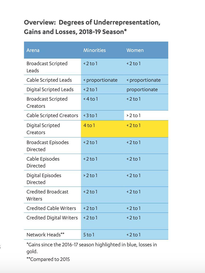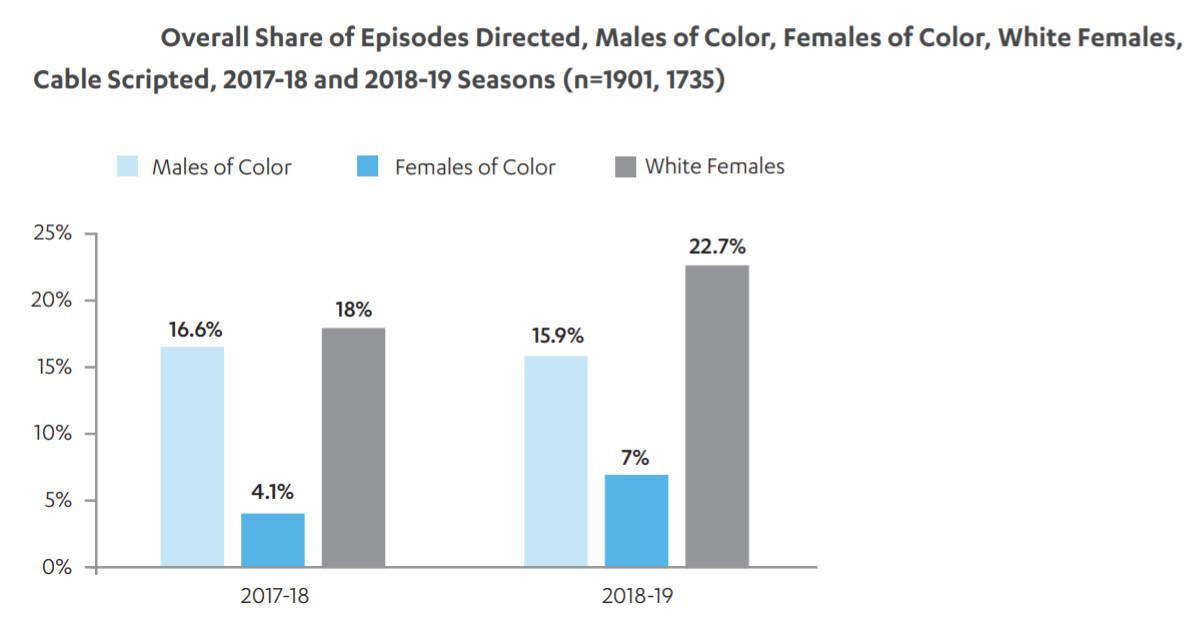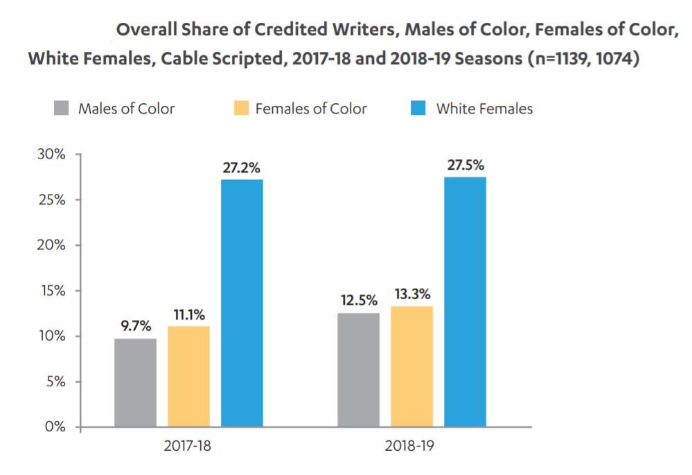 The authors of the Hollywood Diversity Report have documented the demographics of TV casts from the 2011-12 through the 2018-19 seasons. (The ninth installment, on the 2019-20 season, is due out later this month.) Their data analyzed the top eight credited actors in a show to determine a “minority cast share.” Series with a minority cast share of less than 11 percent have consistently represented a plurality of scripted cable shows, albeit to a dramatically decreasing degree of late.