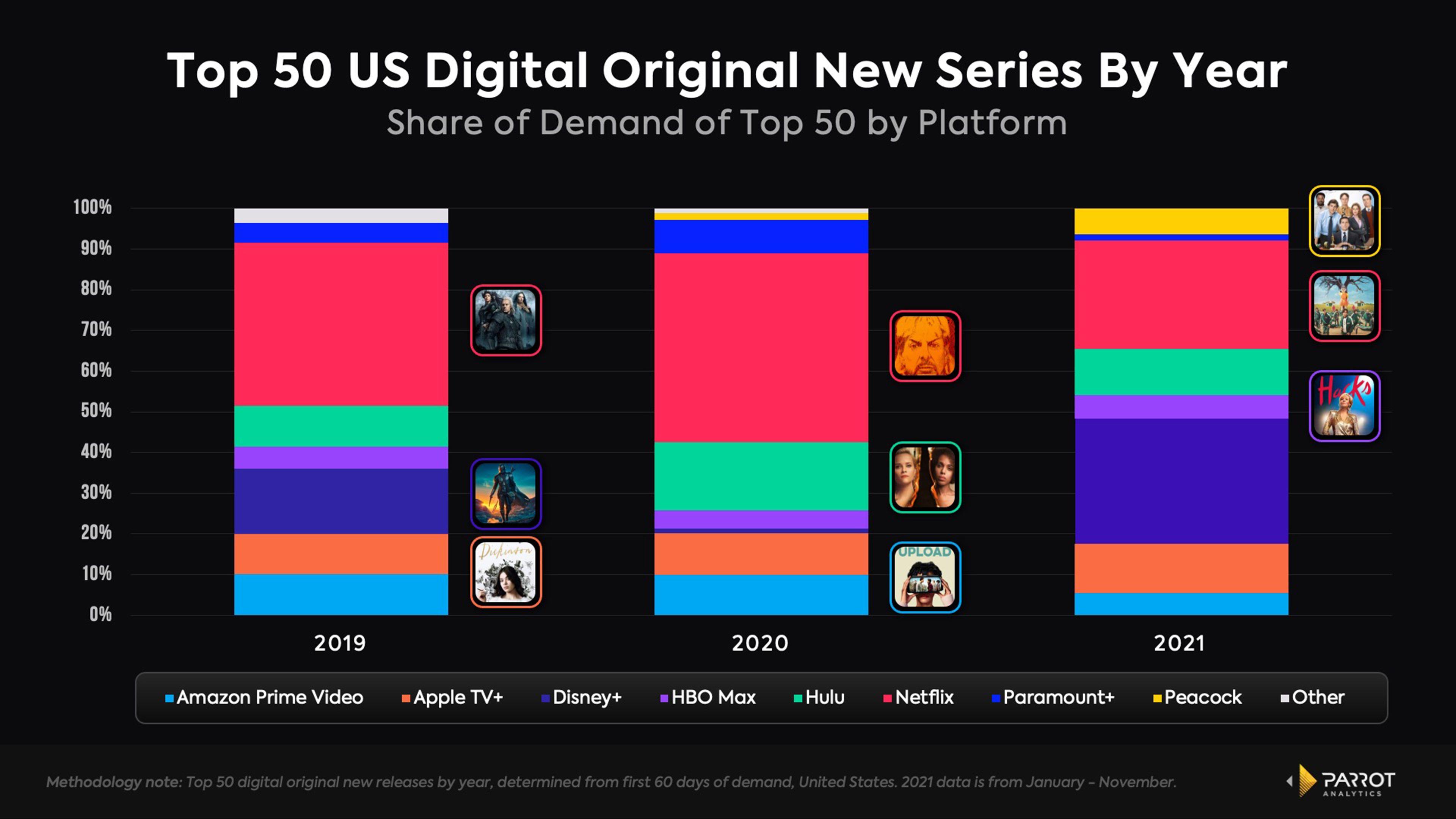 These escalating rivalries are evident in a breakdown of Parrot’s top 50 new releases by platform, which show a shrinking share apportioned to Netflix and a marked increase from other platforms, especially Disney+ (buoyed by Marvel) and Peacock (boosted, if not as dramatically, by The Office). But the evening out is also, intuitively, somewhat obvious. Disney all but sat out 2020, only to turn out four high-profile series in the space of a year; HBO Max may have launched in the early days of quarantine, but major debuts like The Flight Attendant and Gossip Girl were held back for months. In 2021, the floodgates are open—and almost every non-Netflix entrant makes substantial use of the weekly release.