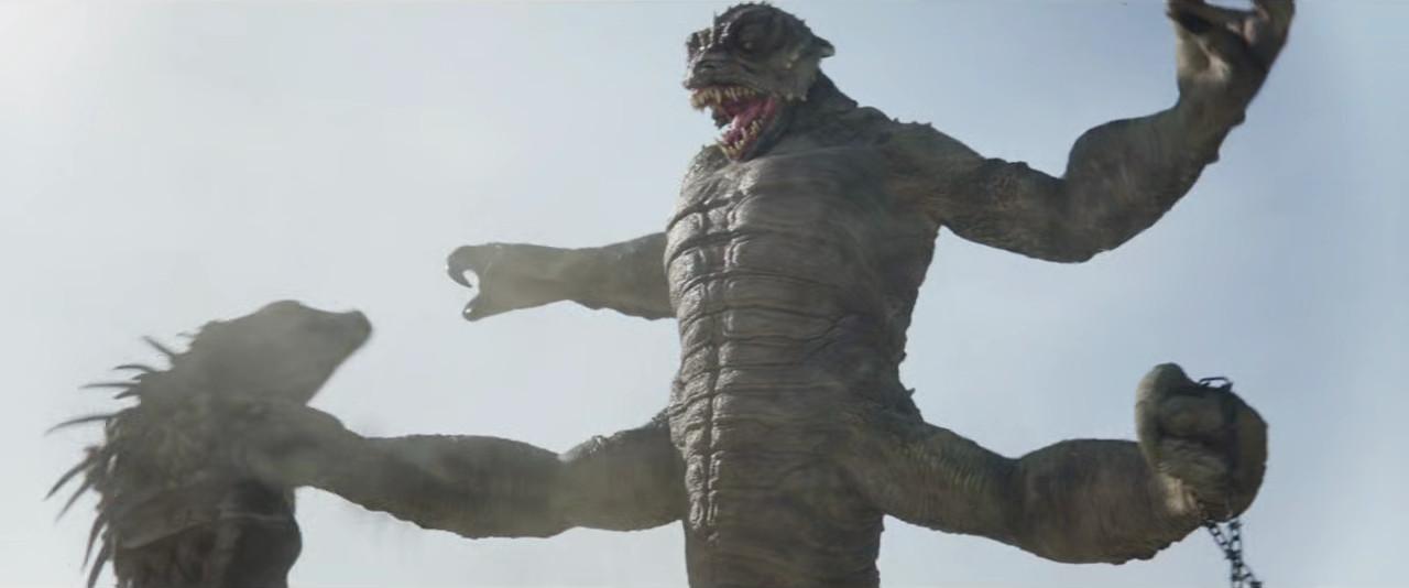 The Rodian is a great gourd-finder, but he delves too greedily and too deep, unearthing Goro from Mortal Kombat (with fewer fingers and extra legs). Yes, evidently Tatooine’s arid biosphere supports yet another nasty creature, which falls between a massiff and a krayt dragon on the intimidation/terror scale. The four-armed monster with 20-pack abs makes quick work of the Rodian and sends the Tusken flying, but Boba manages to mount its back and strangle it with his chain, as enslaved Leia did to Jabba. The victorious Boba, sporting the complexion of post-mutation Ben Grimm, stands atop the fallen beast and brandishes his chain, bringing an end to a scene that won’t win any awards for “Best Star Wars special effects.”
