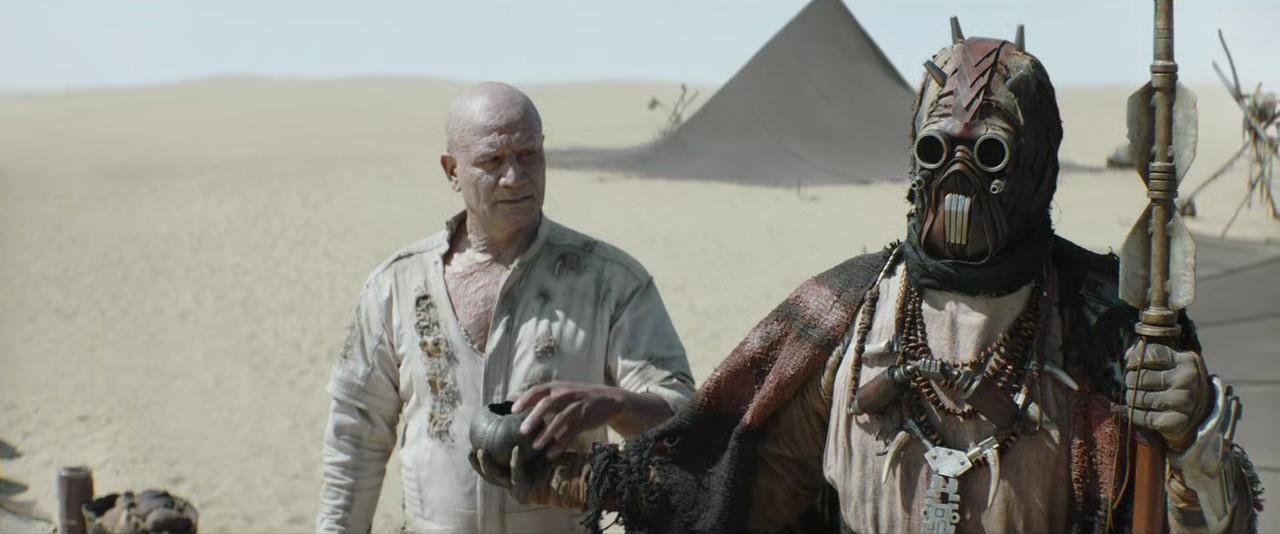 OK, that quote comes from a different ritual, a different desert planet, and a different sci-fi franchise. Even so, it seems clear that this moment marks the beginning of Boba—an orphaned clone who comes from a watery world—making his home (and perhaps finding a family) on a dry one. The Exodus verse that the episode title comes from refers to the Egyptian upbringing of Moses, who freed his people from slavery; in the premiere, Boba frees himself multiple times. Similarly, the Robert Heinlein novel that shares the episode’s name features an Earth native who travels to Mars and is raised by Martians, who teach him their values and culture. In The Mandalorian, Boba wears Tusken robes and wields a gaderffii stick, so some portion of Book of Boba will likely be about how he comes to grok the Tusken lifestyle. Tusken culture has heretofore been shrouded in secrecy, so Star Wars fans could benefit from an education about the hidden corners of Tatooine too. (For one thing, these Tuskens seem to have a different fashion sense from the ones we’ve known.)