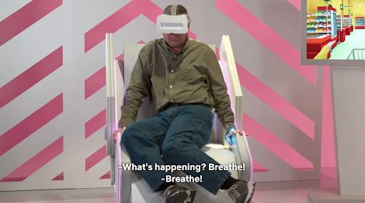 A sketch that eerily came out the same week that Apple unveiled its new Vision Pro headset, “Supermarket Swap” is a Supermarket Sweep parody in which contestants have to grab items from a virtual grocery store. (The game is hosted by The Bear’s breakout star Ayo Edebiri.) Everything starts off harmlessly enough, but when Robinson’s character wins a round and gets to put on the VR headset, he has an existential crisis—and forgets how to breathe: