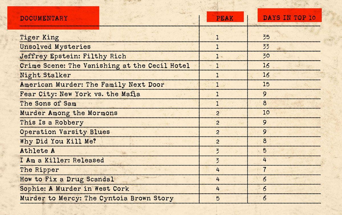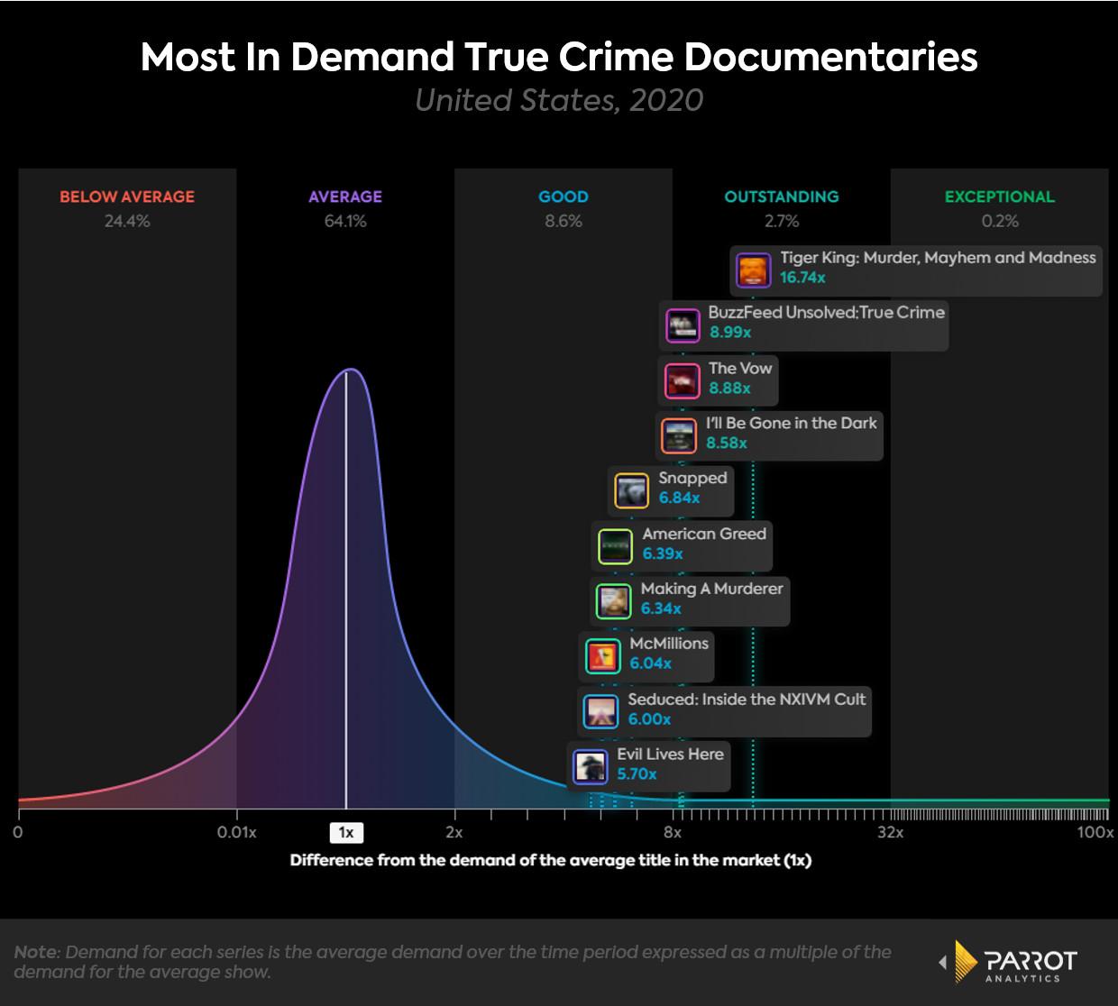 While some of that increase can be attributed to the runaway success of Tiger King—as of June, Netflix’s no. 4 show of all time by first-month viewership metrics—HBO series including The Vow and I’ll Be Gone in the Dark and the long-running Investigation Discovery show Evil Lives Here ranked similarly high in Parrot’s audience-demand metrics in both 2020 and 2021 (through April 30).