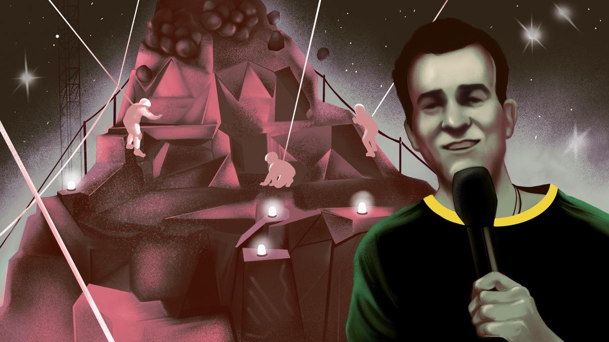 Hecht: We came up with basically what is a giant climbing wall in the shape of a mountain, so we can build a mythology around it. We worked with Mike to create that. Every day, I made him do it differently to remind him that it was drama. It was that moment in Wide World of Sports when we’re about to see that ski jump that’s going to go potentially awry