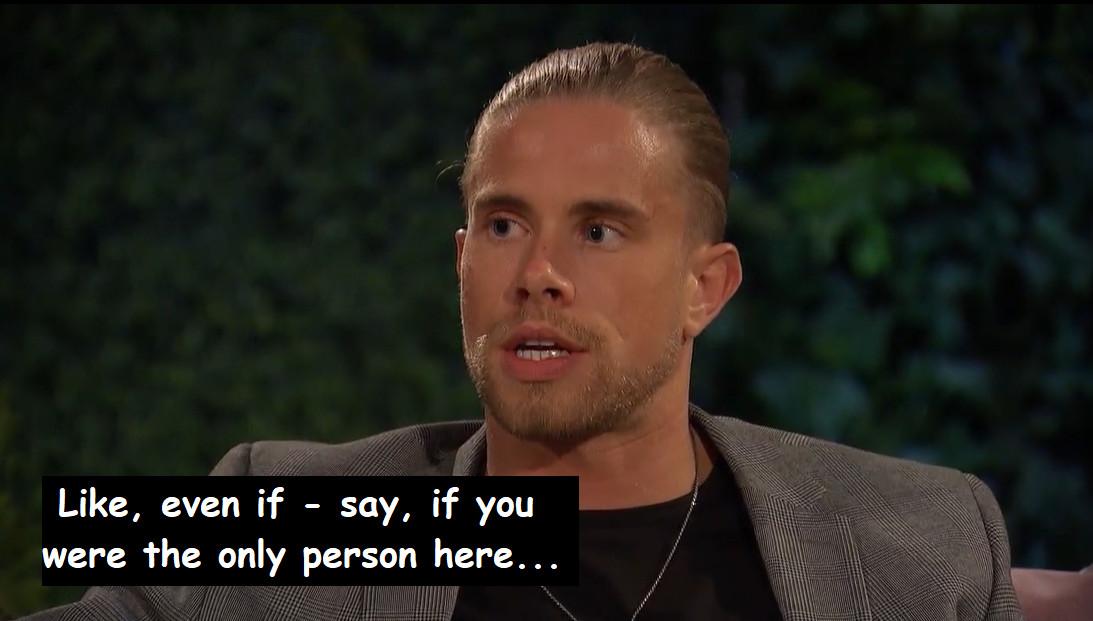 It turns them into half-ponytailed monsters, of course. First, Tyler-Not-Young-Zac-Efron politely gives Gabby a bunch of compliments and then tells her he’s planning to pursue Rachel, which is fine, and exactly how Jason-Not-Michael-Bublé handled the inverse situation with Rachel last week. On the other hand, Hayden takes a different approach wherein he seems like he’s about to give Gabby a bunch of compliments, but then says, and I quote: “I looked at today and my own life, and what my values line up with, and … you’re a little more—I don’t want to say rough around the edges, but, like, y’all want people to be very direct with y’all.”