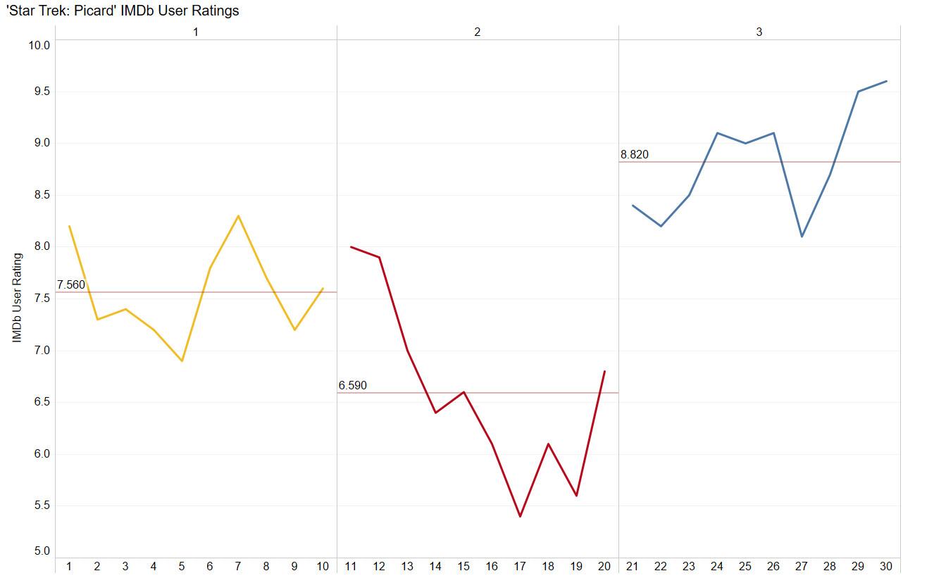 Season 1 started strong but soon stagnated; tellingly, its strongest episode was the one in which Picard visits Riker and Troi. Then came Season 2. To be excessively honest: Picard’s second batch of 10 episodes formed one of the worst TV seasons I’ve ever seen from start to finish—and I watched all of The Walking Dead. By the end, the series’ IMDb user ratings had gone to red alert: