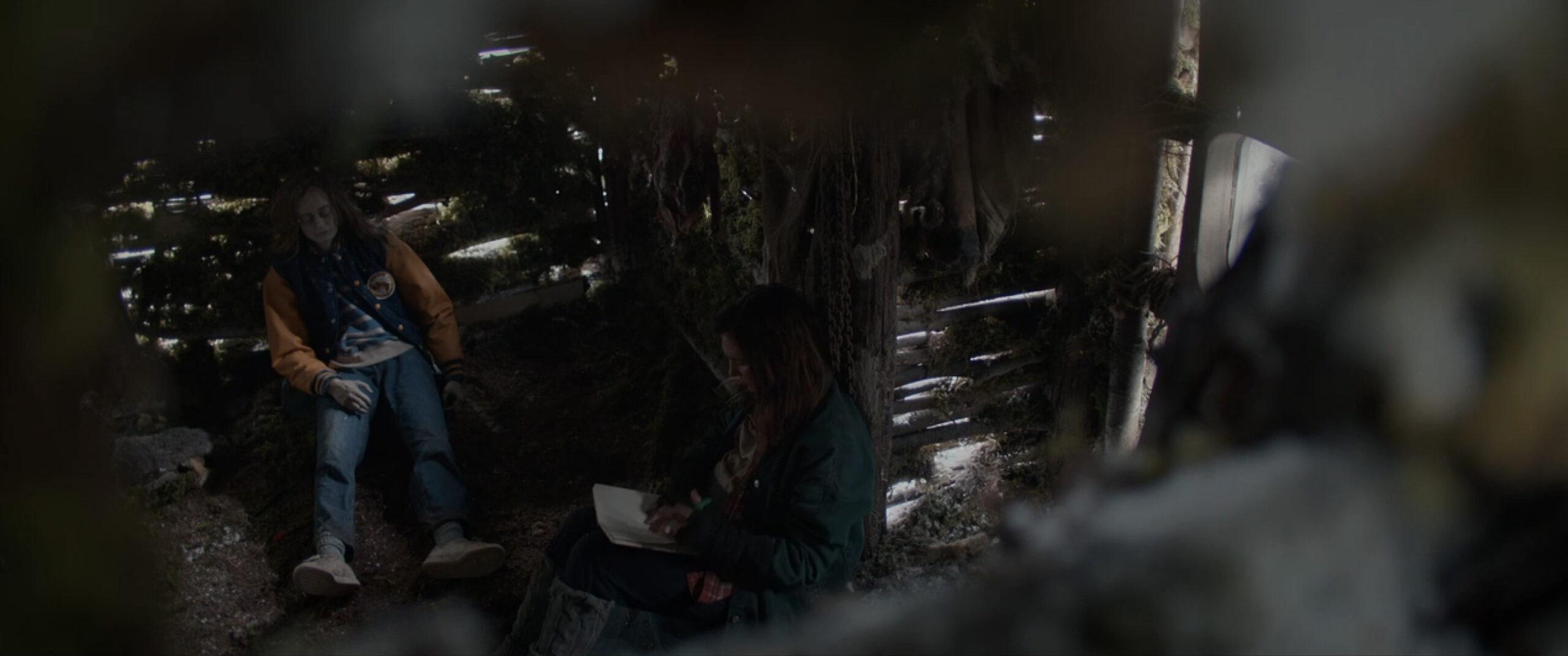 Waking up in the middle of the night to the smell of perfectly sizzled flesh, the girls and Travis convene around the body. “She wants us to,” Shauna says before taking the first chomp into Jackie’s corpse, which now more closely resembles the alien from Annihilation. With the exception of a horrified coach Ben (Steven Krueger), whose survival in the show is looking more precarious by the episode, the gang go into a feeding frenzy. The revolting scene is juxtaposed with the characters in ancient Greek attire and presiding over a lavish feast, which had the undesired effect of making me want to fast until the end of time:
