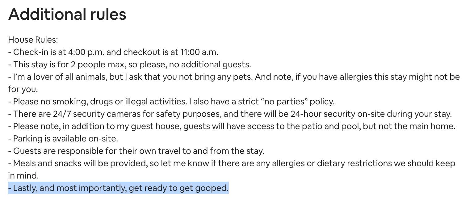 - “Guests acknowledge Airbnb may conduct a review of public records.” And, of course, my eternal greatest downfall: this Sasquatch-sized internet footprint of mine. Be a blogger, they said! Write about pop culture, they said! I guess they never considered that eventually Gwyneth Paltrow might rent her Montecito guest home out on Airbnb for one night only, and would probably prefer to have an earnest fan come stay there than someone who’s going to document every second of their visit to GoopLand. Which, to be clear, I absolutely would. But hey, maybe they won’t Google me. (Or maybe they’ll go straight to my social media profiles where I’ve briefly removed all indicators that I’ve ever so much as dabbled in the blogging arts.)
