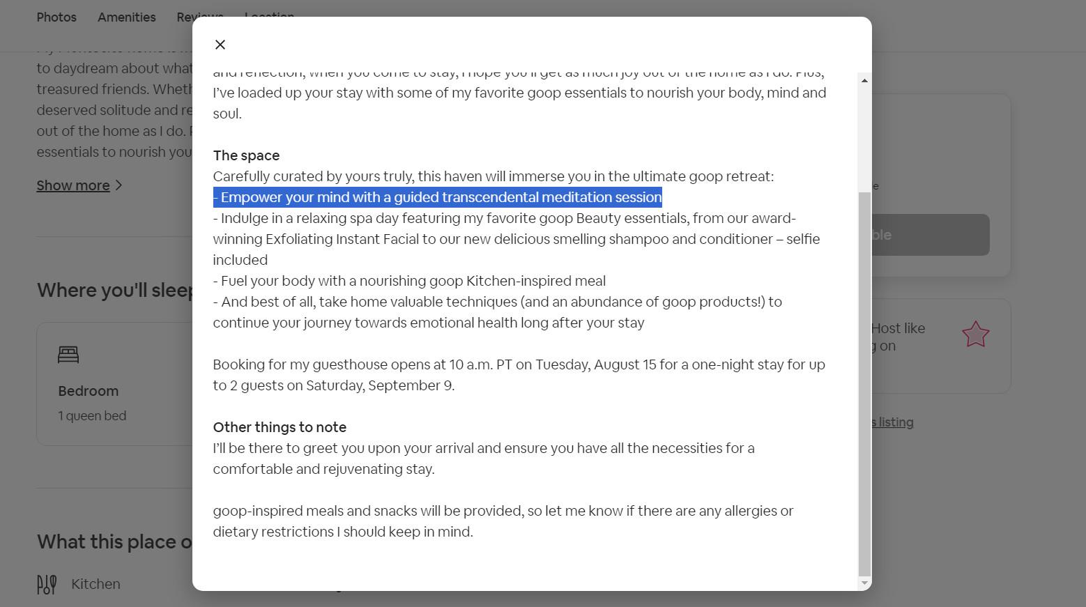 Now that the why has been settled, it’s time to move into the ever-more-challenging how of this equation. As soon as Gwyneth’s Airbnb listing went live on the site and the app, it only raised more questions. There was no calendar of available dates, no nightly price listed, and certainly no cleaning fees or estimated taxes. There was only a block of text informing any interested renters that the booking would “go live” on August 15, at 10 a.m. PT. With further inspection of “The Space” section of the listing, I was at least able to uncover that the one-night booking (not yet available to book) would be for September 9.