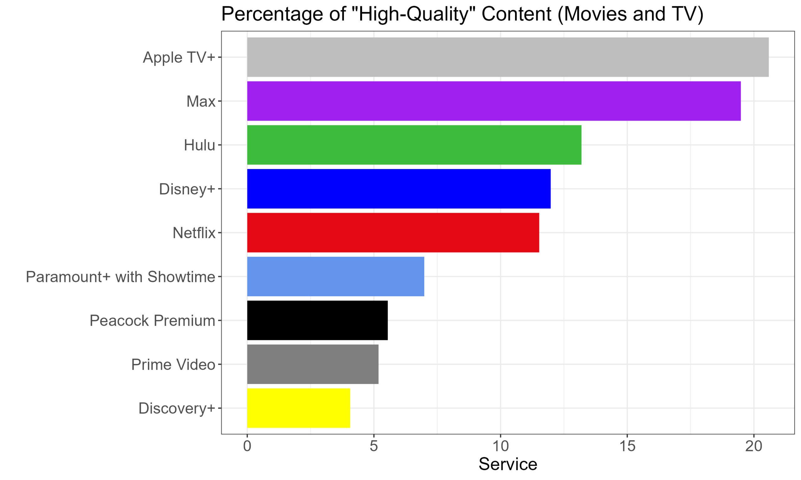 Similarly, data provided by streaming guide Reelgood shows that Apple TV+ leads the streaming pack in the percentage of its catalog considered “high quality,” which Reelgood classifies as anything with an IMDb rating of 7.5 or higher with at least 300 ratings. That holds true whether we look at movie and TV catalogs combined …