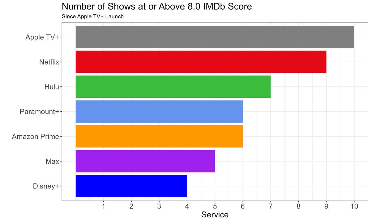 However, Apple’s output is notable even in terms of quantity if we compare it to other services over identical time frames. The chart below shows the number of scripted, original TV series with an IMDb rating of eight or higher released by each streaming service since the launch of Apple TV+.