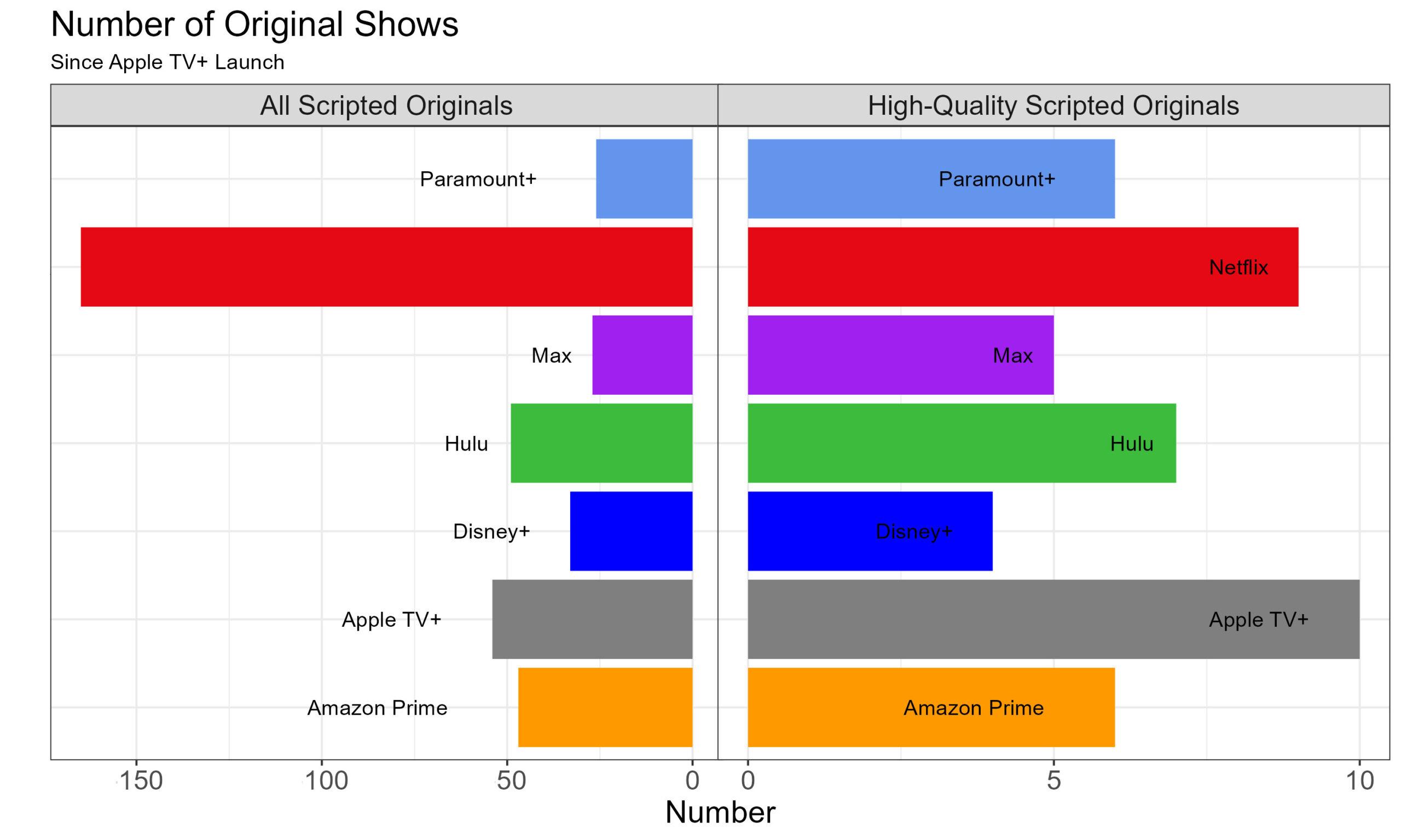 Apple holds a narrow lead over Netflix in that category. What that graph doesn’t show, though, is that Netflix has released many more shows in total, making Apple’s tally more impressive by comparison. This chart shows the number of highly rated scripted series on the right and the total number of scripted series on the left.