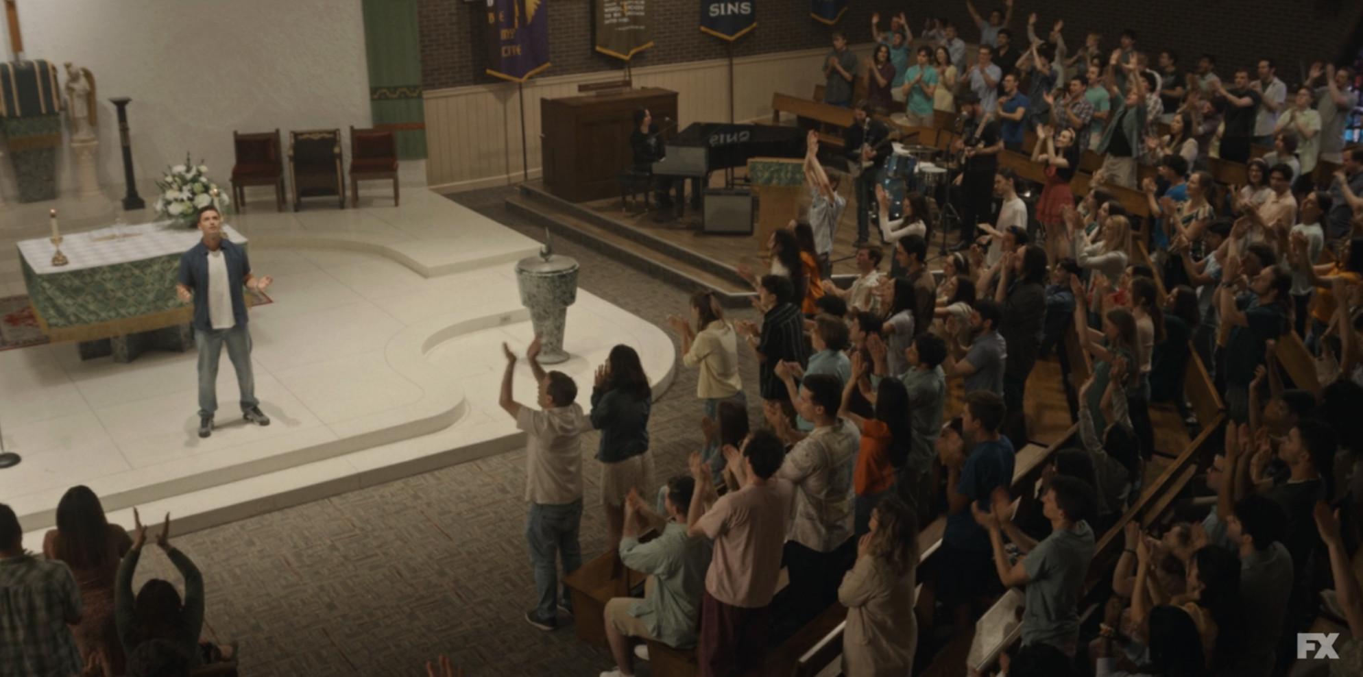 Yes, that’s Tebow preaching at a church event in Episode 3, “Pray the Gay Away.” Schwarzenegger nails Tebow’s Southern preacher pitch and cadence, but the sermon falls flat as Tebow cosplay.