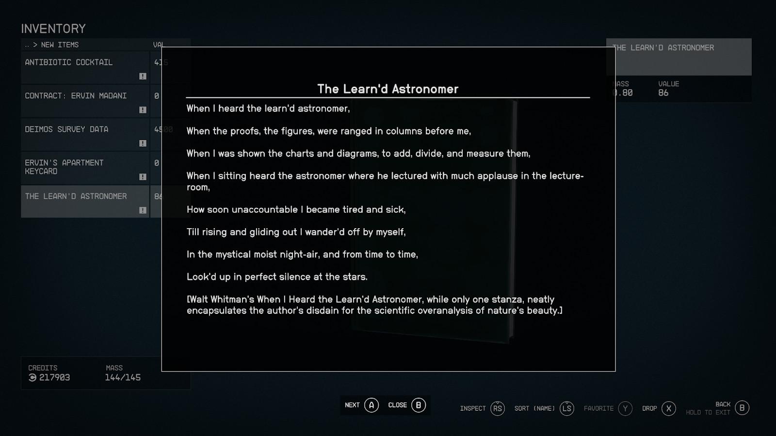 I appreciate the aspects of Starfield’s learned-astronomer side that do inspire awe—that the game’s gravity varies based on the mass of the moon or planet, that its lighting reflects the positions of celestial bodies, that its physics for small objects seem to work so well. But Starfield’s spine-tingling moments blend with the banal ones, alternately blowing and numbing the mind. When I found Whitman’s poem, I slipped the bound book into the nebulous space where video game characters store stuff. Then I opened the inventory to see what it weighed, to make sure I could carry it without violating the limit and slowing myself down. Yes, that settles it—this is Skyrim in space.