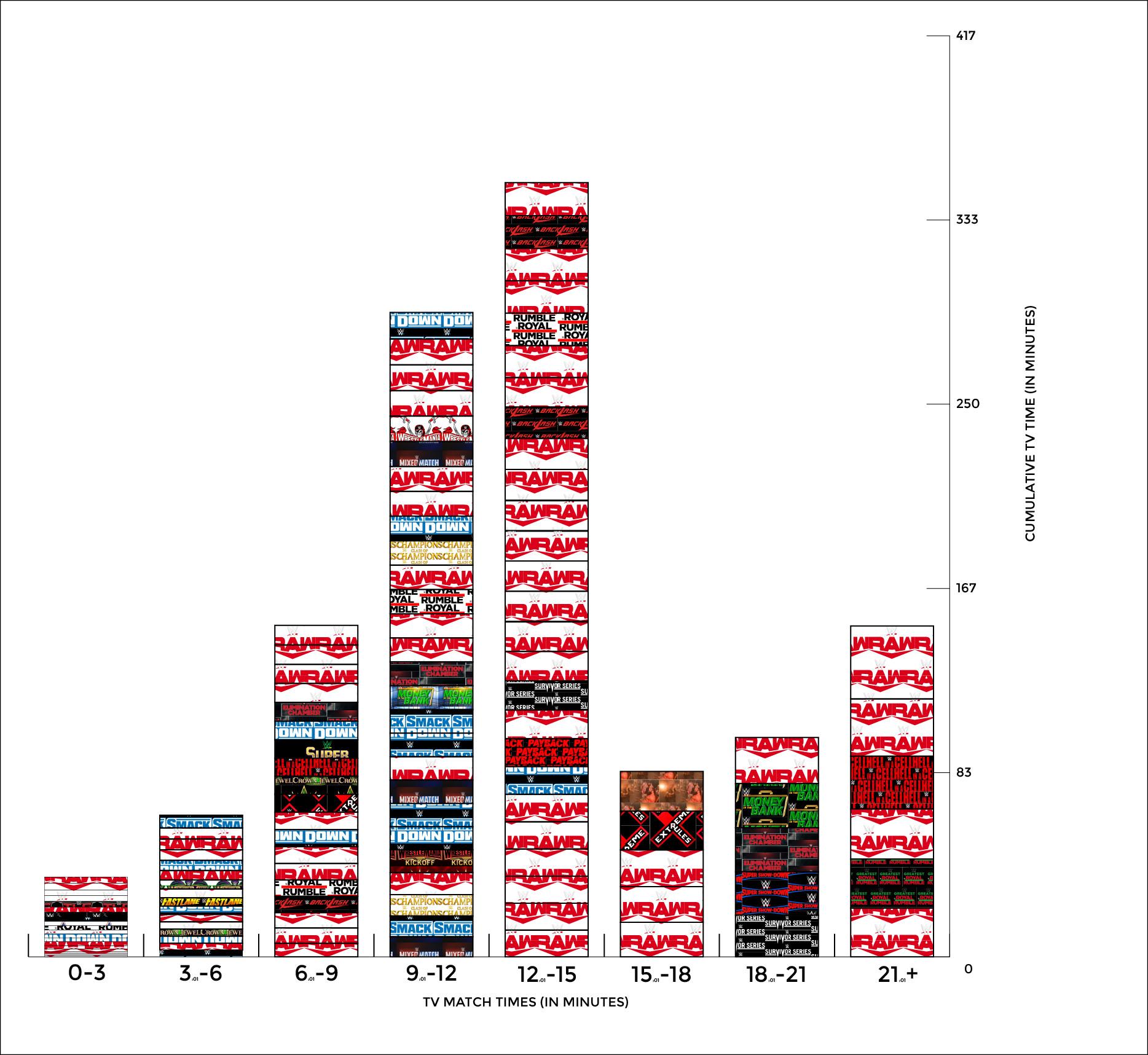 From there, you get to the meat of WWE’s menu, with matches featuring 9–15 minutes of in-ring action making up most of WWE’s TV and PPV time. If those shorter matches are webisodes made to tell a more complete version of the world a longer-form series takes place in, matches of this length are the normal, full-length episodes that make up the bulk of the story being told about a given performer. As is the case with essentially everyone, these are also the kinds of matches in which Braun has spent (by several hours) the most time on our TV screens. After this, there’s a massive dropoff before the momentum of multi-man match participation brings the amount of time we’ve seen Braun appear in genuinely long matches (21 minutes or longer) in line with the amount of time we’ve seen him in those of the six-to-nine-minute variety (which is to say: a relatively small amount of time in terms of his actual action in contests with lengths that are almost entirely a function of the context of the time constraints of the show on which they take place).