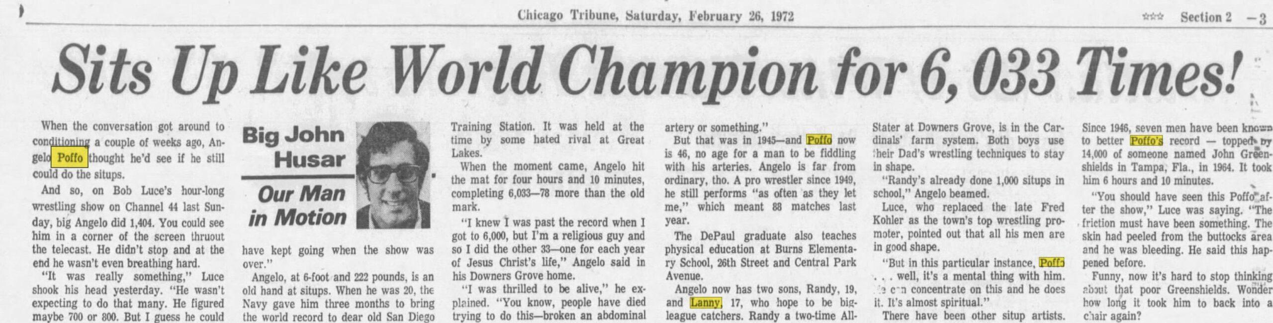 Angelo had built his reputation on general athleticism—he was one of the better-built and more mobile wrestlers of his era—as well as a startling 1945 feat of strength that won him acclaim as a world-record holder: He completed 6,033 sit-ups in 4 hours and 10 minutes while serving in the U.S. Navy (the extra 33 reps were in commemoration of Jesus’s 33 years of life; both Angelo and Lanny were religious, and neither failed to mention the extra 33 reps when discussing Angelo’s achievement). Angelo’s base of operations was the Midwest; he served as a main-event mainstay for Fred Kohler’s Illinois-based wrestling promotion, held the Chicago version of the NWA United States Heavyweight Championship, and won the World Tag Team Championships in Dick the Bruiser and Wilbur Snyder’s Indianapolis-based World Wrestling Association on three separate occasions.
