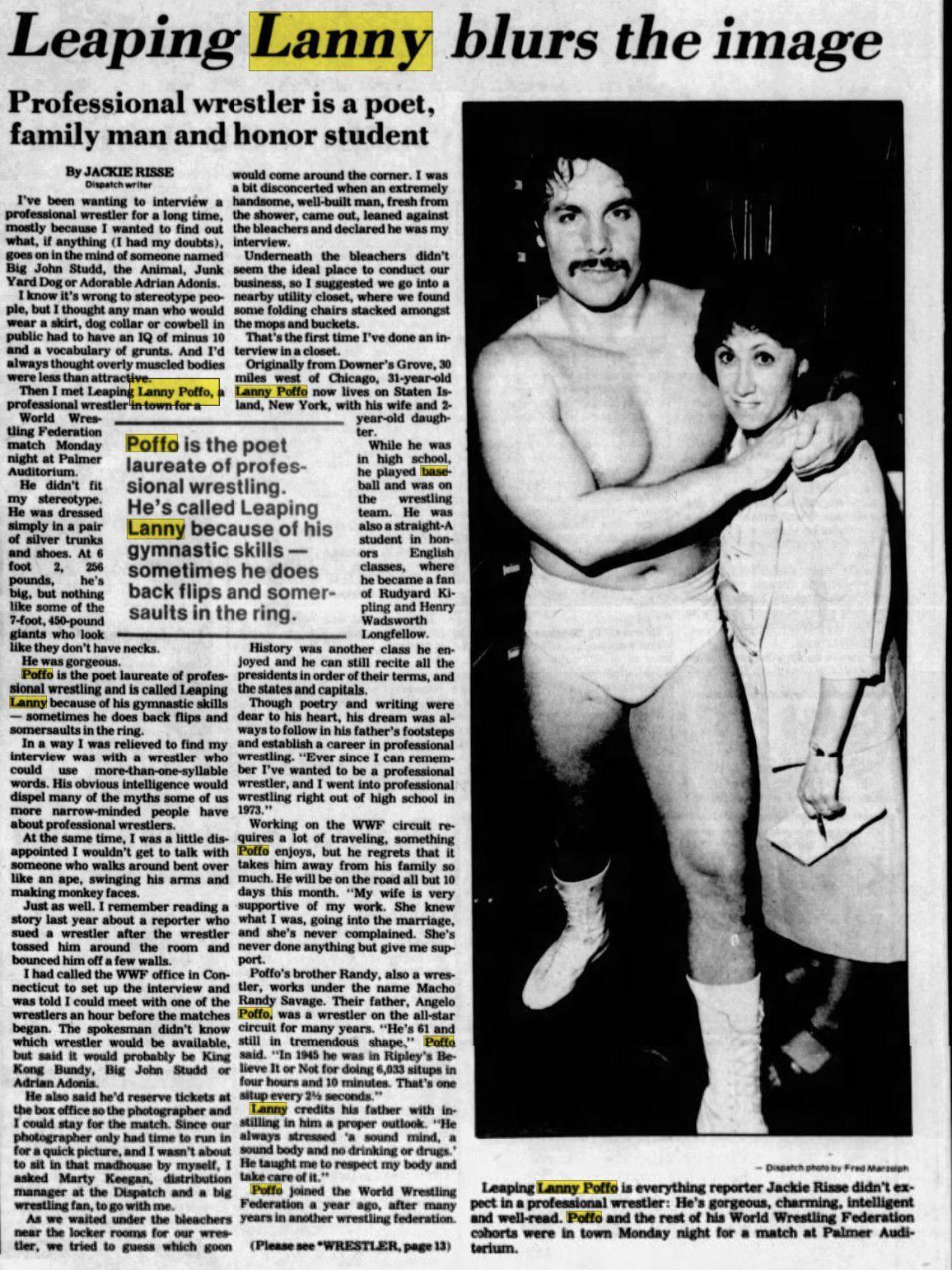 At that point, it might have seemed like Lanny was destined for stardom: He could talk, he had a great build, and he was one of the few domestic wrestlers doing sentons and moonsaults in the early to mid-1980s (his moonsault, or “leaping backflip,” as announcer Vince McMahon called it, was arguably safer and smoother than the similarly sized Great Muta’s version of the move). The WWF didn’t pair him with Randy or even acknowledge their relationship, but Lanny had everything it took to succeed in the spotlight. However, as “Leaping” Lanny Poffo, he remained a good guy who merely wrestled in competitive matches. He built on that babyface gimmick, though, reading poems he had written, often poems that mocked the bad guy he was about to wrestle (an updated, hip-hop variation on this insult-comedy gimmick helped AEW’s the Acclaimed seize that promotion’s tag titles). These poems were affixed to Frisbees that Lanny would then toss into the crowd. The Frisbee tossing won him no small amount of attention; a fawning 1986 profile in The Dispatch described him as “gorgeous,” the “poet laureate of professional wrestling,” a “straight-A student,” a “fan of “Rudyard Kipling and Henry Wadsworth Longfellow,” and able to “recite all the presidents in order of their terms, and the states and capitals.”